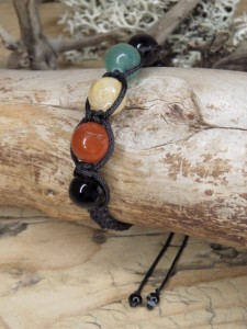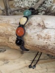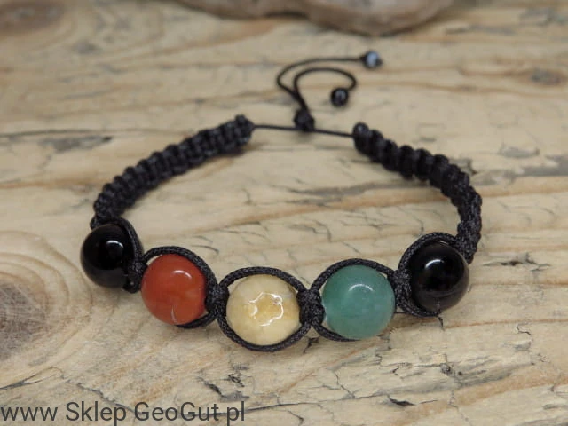 Bransoletka RASTA wykonana z kamieni naturalnych - czarnego turmalinu, jaspisu czerwonego, żółtego agatu, awenturynu, i czarnego obsydianu. Bransoletka została spleciona ze sznureczków w modnym stylu metodą makramy. Ręcznie wykonana bransoletka (handmade) dopasowuje się do niemal każdego damskiego nadgarstka dzięki przesuwanemu zapięciu.