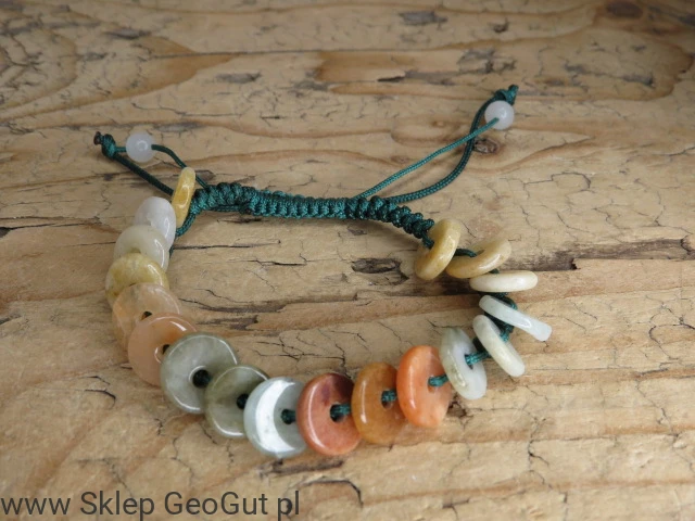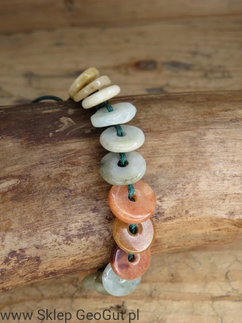 Odkryj wyjątkową bransoletkę wykonaną z naturalnego jadeitu prosto z Birmy! Kamienie w kształcie talarków, o średnicy około 1,1 cm, zachwycają odcieniami od żółtego, przez zielony, aż po pomarańczowy.