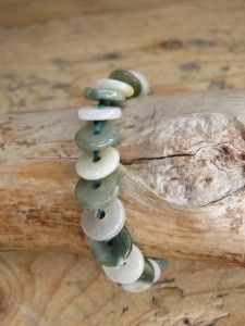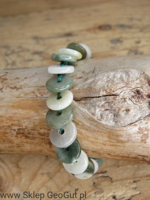 Odkryj wyjątkową bransoletkę wykonaną z naturalnego jadeitu prosto z Birmy! Kamienie w kształcie talarków, o średnicy około 1,1 cm, zachwycają odcieniami zieleni.