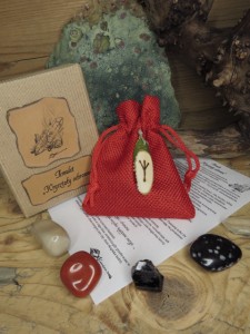 Na woreczku ochronna runa Algiz, wypalona na plasterku z surowego drewna brzozowego.