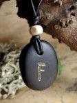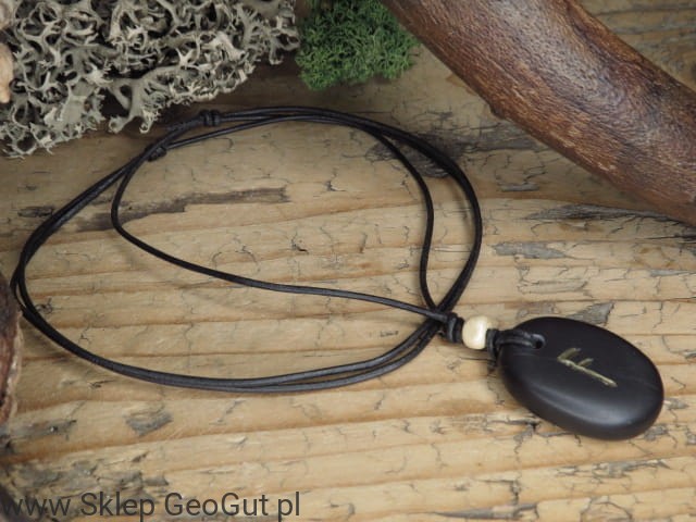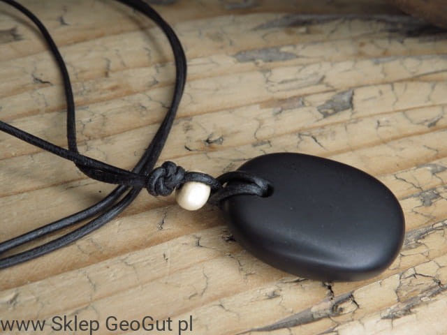 - Kamień zawieszony na czarnym, skórzanym rzemieniu, ozdobiony drewnianym koralikiem.