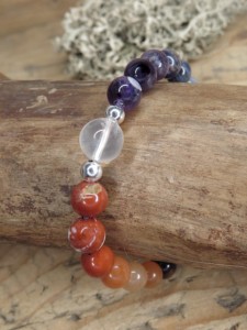 Bransoletka na elastycznej gumce z kamieniami odpowiadającymi kolejnym czakrom: jaspis, awenturyn pomarańczowy, tygrysie oko, awenturyn, kwarc niebieski, sodalit, ametyst oraz kryształ górski.