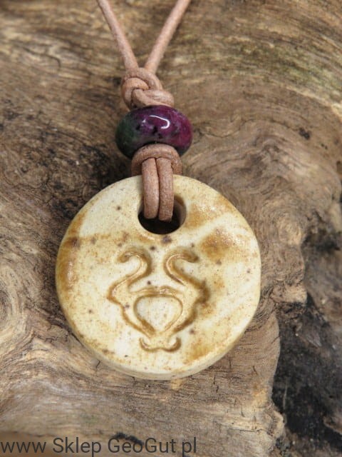 Wisiorek zawieszony jest na naturalnym beżowym rzemyku z regulowaną długością (przeciągane supełki). Nad ceramicznym symbolem Byka umieszczony został zoisyt z rubinem – kamień wspierający siłę, równowagę, regenerację i odwagę, idealnie dopasowany energetycznie do Byków.