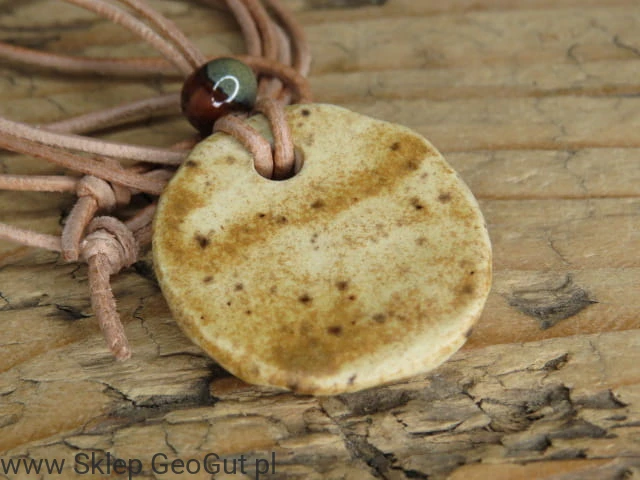 Nad wisiorkiem umieszczono ceramiczny brązowo-szary koralik, który harmonijnie dopełnia barwy szkliwa i dodaje lekkości. Całość zawieszona jest na beżowym rzemyku z regulowaną długością, co pozwala dopasować naszyjnik do indywidualnych preferencji.