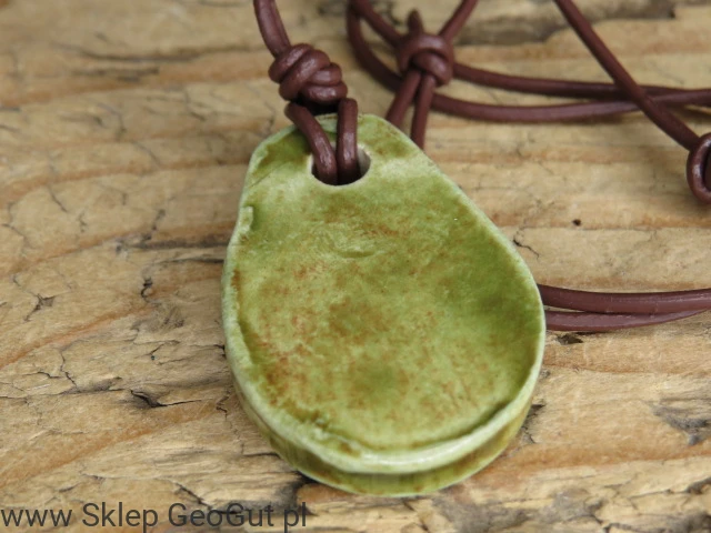Wisiorek został pokryty zielono - brązowym szkliwem, nadającym mu naturalny, leśny charakter. Całość zawieszona jest na brązowym rzemyku z regulowaną długością, umożliwiając wygodne dopasowanie.