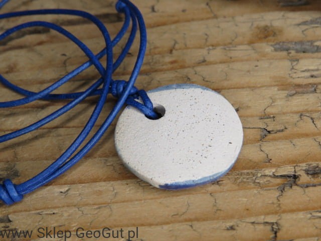 Ręcznie wykonany ceramiczny wisior o wymiarach 3 cm, w granatowo-niebieskim szkliwie na granatowym rzemyku. Unikatowe połączenie kolorów nadaje mu organiczny, ziemisty charakter, idealny dla miłośników naturalnej i etnicznej biżuterii.