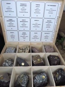 Profesjonalny dydaktyczny zestaw skał magmowych w drewnianej skrzynce, opracowany merytorycznie przez naszą pracownię petrograficzno – mineralogiczną.