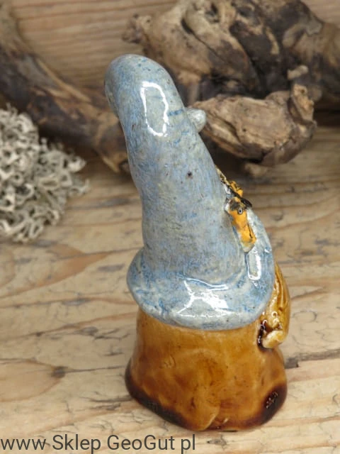 Ręcznie wykonana figurka ceramiczna skrzat z żółtym motylem na czapce to wyjątkowa dekoracja inspirowana światem natury i leśnych opowieści. Skrzat ma szarą czapkę ozdobioną żółtym motylem, brązowy płaszczyk, długą brązową brodę sięgającą ziemi oraz charakterystyczne sumiaste wąsy, które nadają mu baśniowego charakteru.
