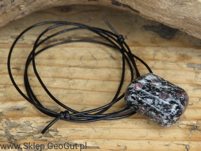 Kamień zawieszony jest na czarnym, skórzanym rzemieniu z regulacją długości, co zapewnia wygodę noszenia. Granat od wieków uznawany jest za kamień energii życiowej, odwagi i pasji, wzmacnia determinację oraz motywację do działania. Amfibolit natomiast działa stabilizująco i ochronnie, wspierając równowagę emocjonalną i poczucie bezpieczeństwa.