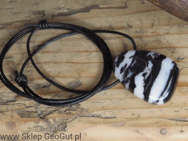 Symbol ręcznie wygrawerowany na marmurze zebra, pozłocony farbką. Wisior na czarnym rzemieniu.
