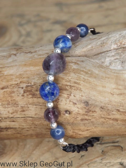 Bransoletka dla Strzelca, łącząca ametyst, sodalit, lapis lazuli i fluoryt, wspiera intuicję, koncentrację oraz rozwój duchowy, chroniąc jednocześnie przed negatywnymi energiami i wspomagając równowagę emocjonalną. Bransoletka jest spleciona z czarnych sznureczków w modnym stylu metodą makramy.