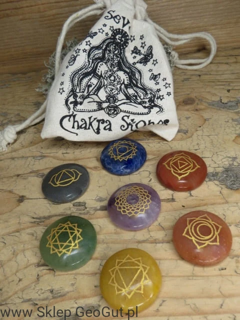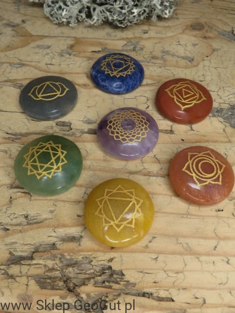 Kamienie posiadają wygrawerowane i pozłocone farbką symbole poszczególnych czakr.