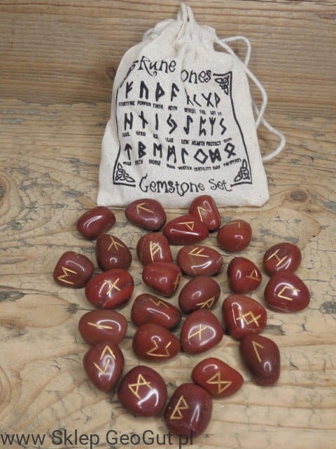 Zestaw 25 run (24 runy oraz jedna runa pusta "wyrd") grawerowanych na jaspisie czerwonym. Kamienie są szlifowane. Wielkość kamieni około 1,5-2cm.