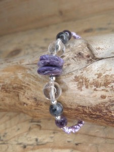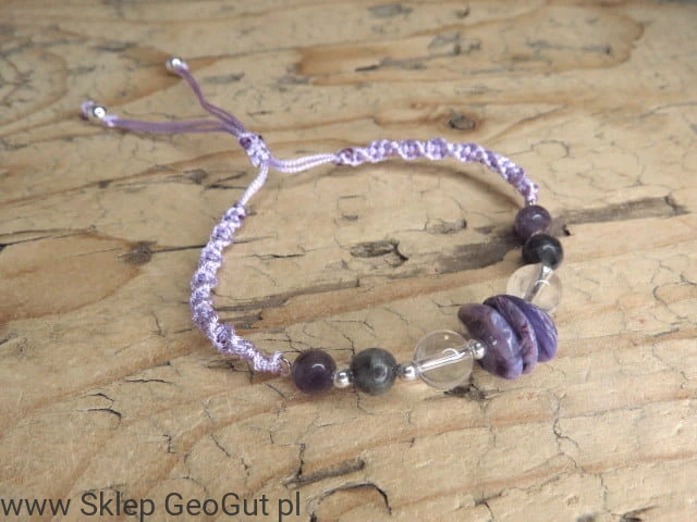Bransoletka zawiera kamienie, które pomogą Wam wzmocnić aurę, przepływ energii i wspomagają w rozwoju duchowym. Te kamienie to labradoryt, ametyst, kryształ górski, czaroit.