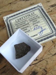 Meteoryt kamienny z certyfikatem autentyczności wystawionym przez członka Polskiego Towarzystwa Meteorytowego.