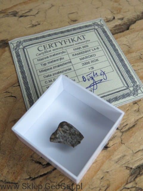 Meteoryt kamienny z certyfikatem autentyczności wystawionym przez członka Polskiego Towarzystwa Meteorytowego.