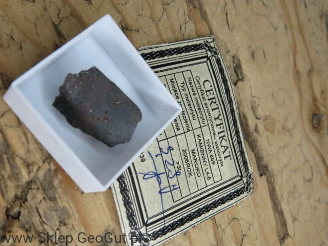 Meteoryt kamienny z certyfikatem autentyczności wystawionym przez członka Polskiego Towarzystwa Meteorytowego.