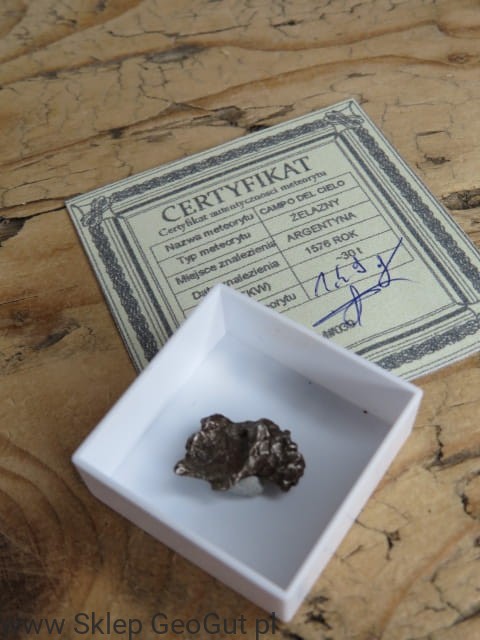 Meteoryt żelazny z certyfikatem autentyczności wystawionym przez członka Polskiego Towarzystwa Meteorytowego.