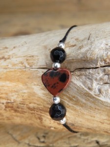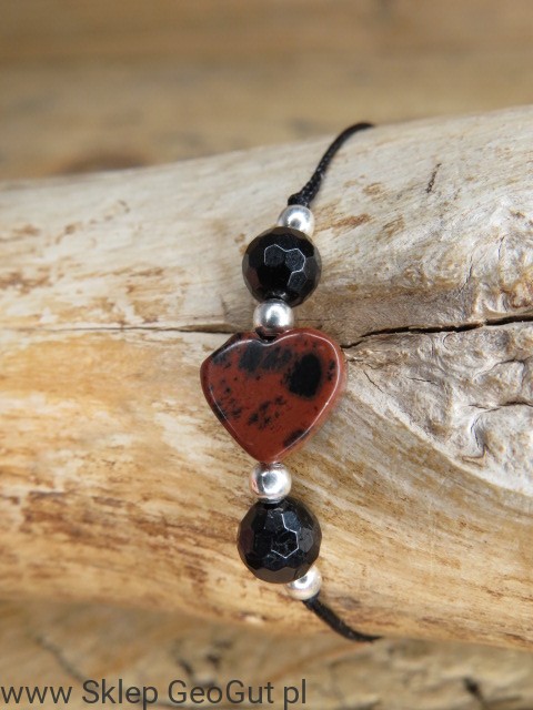 Minimalistyczna bransoletka z sercem z obsydianu mahoniowego i czarnym turmalinem /Ag