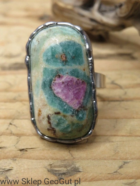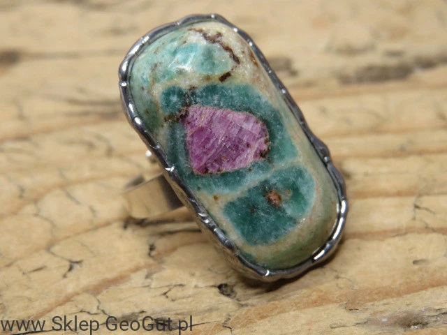 Pierścionek jest unikatowy – kamień ma niepowtarzalny układ barw, w którym rubinowe punkty pięknie kontrastują z zielenią fuchsytu.