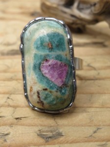 Pierścionek z rubinów w fuchsycie to wyjątkowy, ręcznie wykonany amulet łączący siłę rubinu z delikatną energią fuchsytu. Duży, polerowany kamień o wymiarach 3,1 × 1,6 × 1 cm został oprawiony w miedź i cynę, co nadaje mu niepowtarzalny, surowo-artystyczny charakter.
