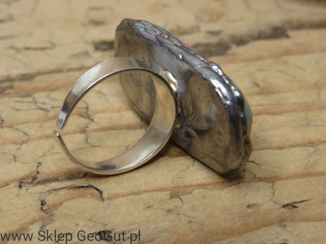 Obrączka jest posrebrzana i regulowana, dzięki czemu pierścionek dopasowuje się do większości rozmiarów palców.