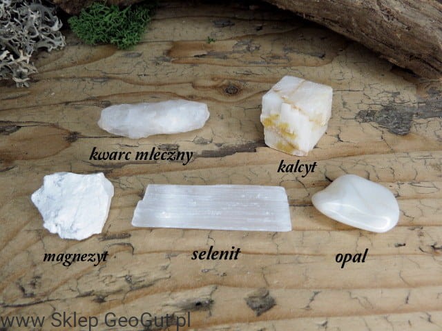 kwarc mleczny, selenit, opal biały, kalcyt, magnezyt