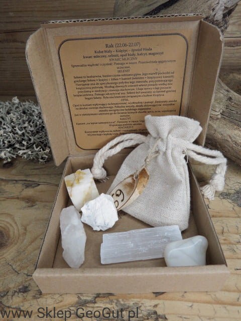 Do woreczka dołączona jest zawieszka z surowego drewna z wypalonym znakiem zodiaku. Całość zapakowana w pudełeczko z opisem.