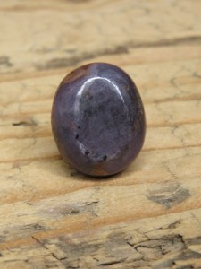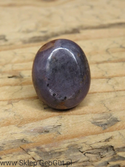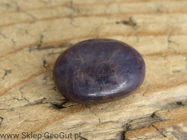 Okaz rubinu. Kamień wypolerowany, posiada wgłębienia i spękania wynikające ze struktury kamienia.