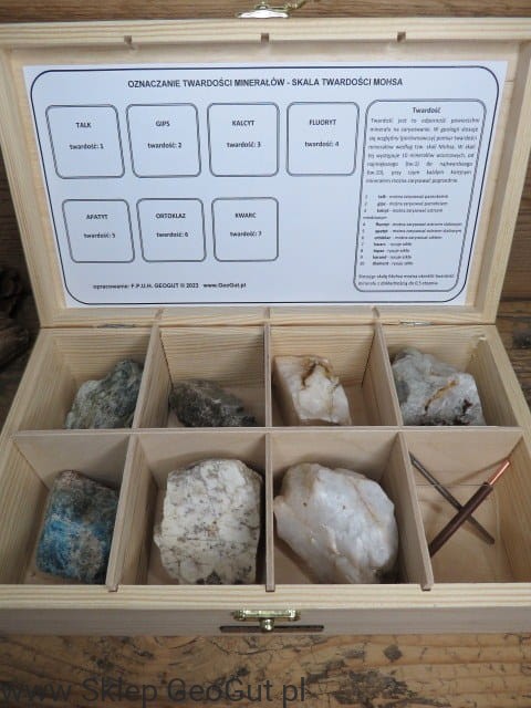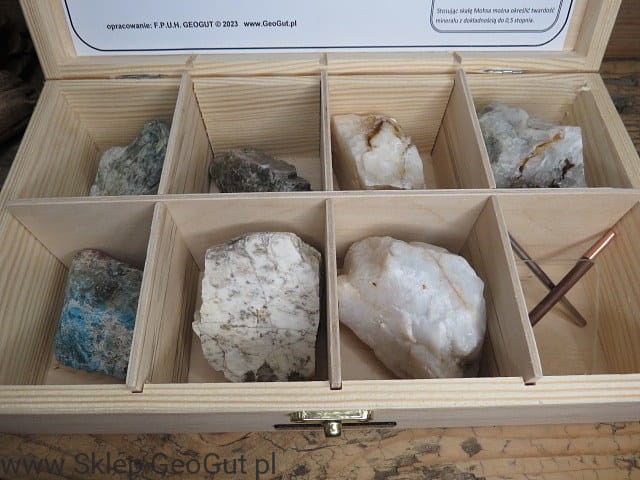 Dodatkowo, w zestawie znajduje się szybka szklana oraz rysik stalowy i miedziany do badania twardości minerałów.