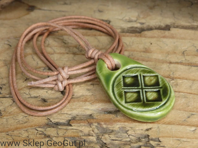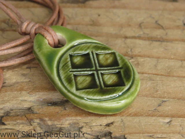 Ręcznie wykonany wisior z symbolem Mokoszy to wyjątkowy talizman inspirowany słowiańską tradycją. Pokryty jasnym zielonym szkliwem, które symbolizuje życie, wzrost i naturalną siłę przyrody. Wisior zawieszony jest na beżowym rzemyku z regulowaną długością, umożliwiającym dopasowanie do każdej stylizacji.