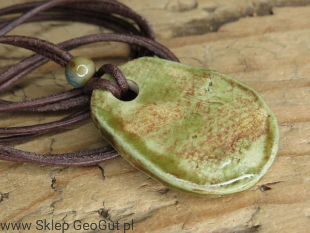 Wisiorek pokryty jest szkliwem w odcieniach zieleni i brązu, co nadaje mu naturalny, pierwotny charakter. Zawieszony na brązowym rzemyku z regulowaną długością, można go łatwo dopasować do indywidualnych preferencji.