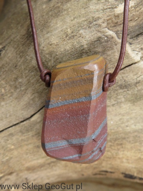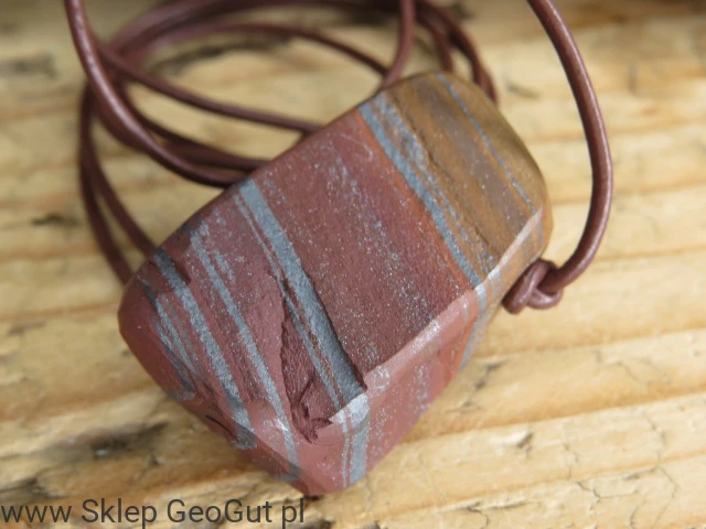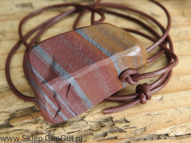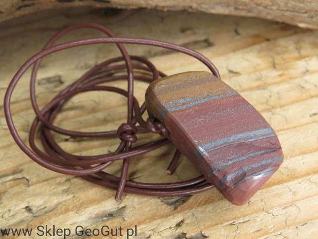 Kamień został przecięty i uformowany w Szlifierni GeoGut, co pozwoliło wydobyć piękno jego struktury i podkreślić naturalny wzór skały. Został również przewiercony i zawieszony na skórzanym rzemieniu w kolorze brązowym. Długość rzemyka można wygodnie regulować za pomocą przeciąganych supełków.
