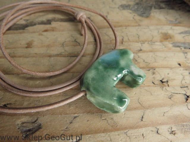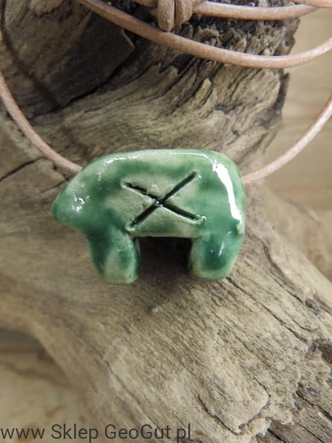 Unikatowy wisior ceramiczny inspirowany rzeźbą „Misia” ze Ślęży – świętej góry starożytnych Słowian. Ręcznie wykonany z gliny, pokryty zielonym szkliwem i wypalony w piecu w pracowni ceramicznej. Symboliczny amulet słowiański nawiązuje do dawnych wierzeń i tajemnic kultowego miejsca z Dolnego Śląska.