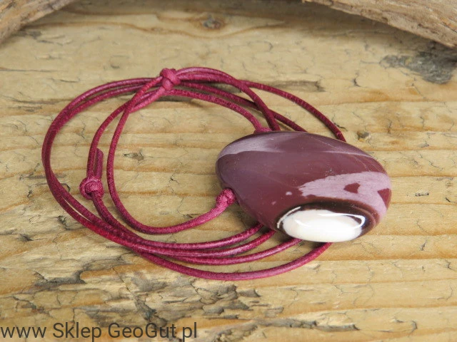 Wisior z naturalnego jaspisu mookait na bordowym, regulowanym rzemyku to talizman siły, odwagi i wewnętrznej równowagi. Jaspis mookait wspiera pewność siebie, motywację i chęć działania. Pomaga podejmować decyzje, chroni przed negatywnymi wpływami i wzmacnia energię życiową. Każdy kamień jest unikalny, a jego ciepłe, ziemiste barwy podkreślają naturalne piękno i harmonię.
