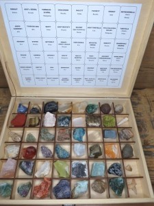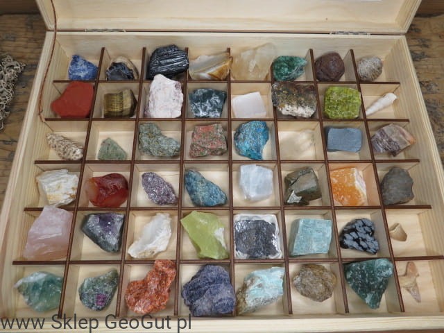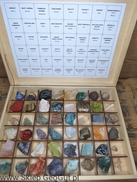 W skład zestawu wchodzą 42 minerały: sodalit, agat, turmalin - schorl, chalcedon, kalcyt, fuchsyt, granat, jaspis, tygrysie oko, baryt, agat mszysty, selenit - gips, agat turitella, opal/chalcedon zielony, aragonit, dysten (cjanit), aktynolit,unakit, chryzokola, kryształ górski, hematyt, skaleń, karneol, lepidolit, apatyt, kalcyt błękitny, piryt, aragonit pomarańczowy, kwarc różowy, ametyst, opal, serpentyn, galena, amazonit, obsydian śnieżny, fluoryt, rubin, kalcyt ognisty, fluoryt, pimelit, gips, awenturyn.