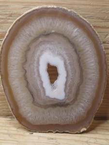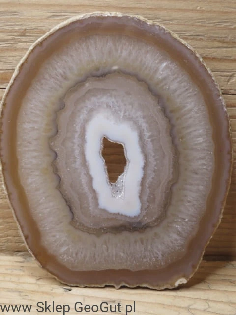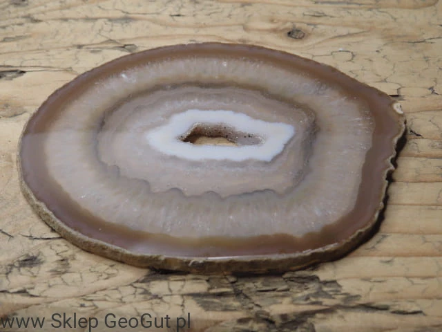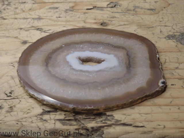 Dwustronnie polerowany plaster agatu. Wnętrze koronkowe z geodą.