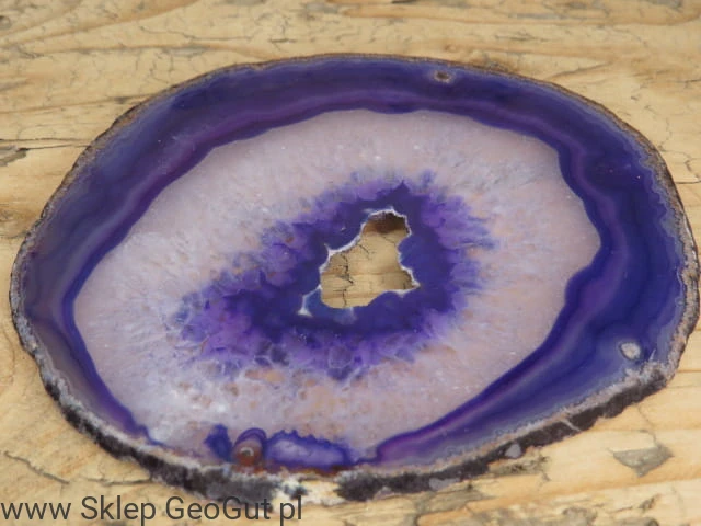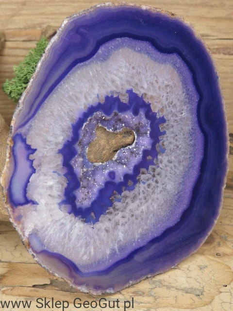 Dwustronnie polerowany plaster agatu. Kamień barwiony na kolor fioletowy. W środku geoda z kryształkami kwarcu.