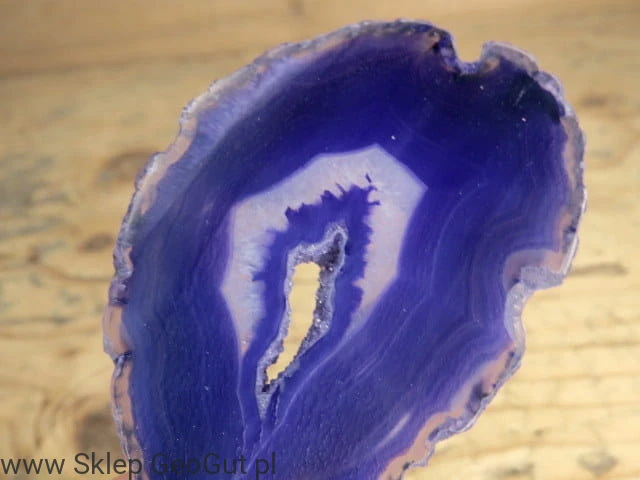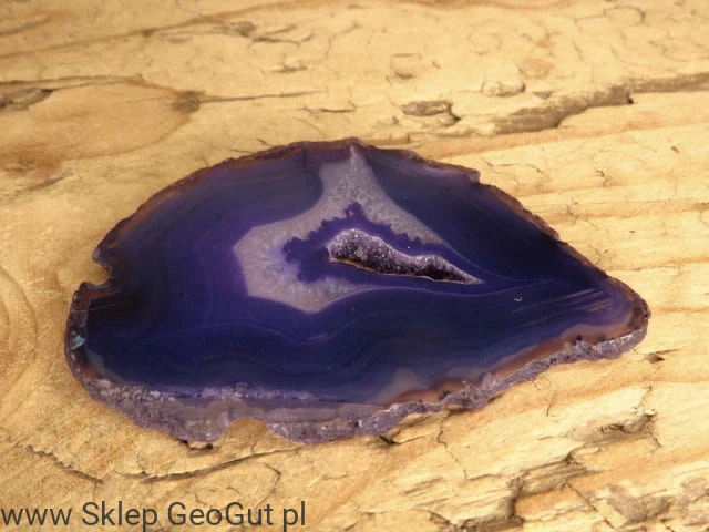 Dwustronnie polerowany plaster agatu. Kamień barwiony na kolor fioletowy. Wnętrze agatu- geoda.