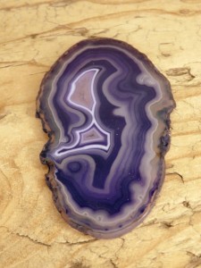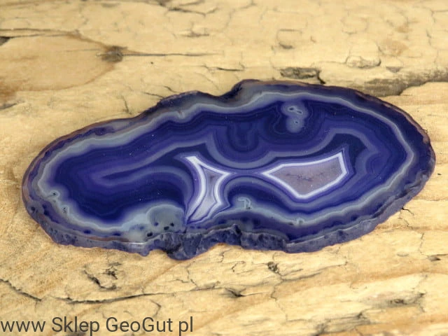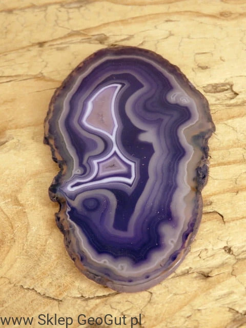 Dwustronnie polerowany plaster agatu. Kamień barwiony na kolor fioletowy. Wnętrze agatu- geoda.