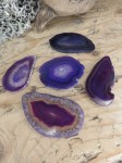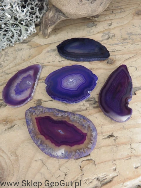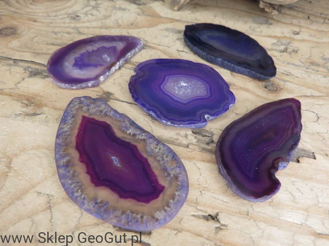 Dwustronnie polerowane plastry agatu. Kamienie barwione na kolor fioletowy.