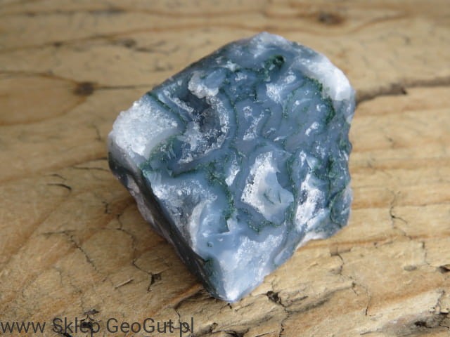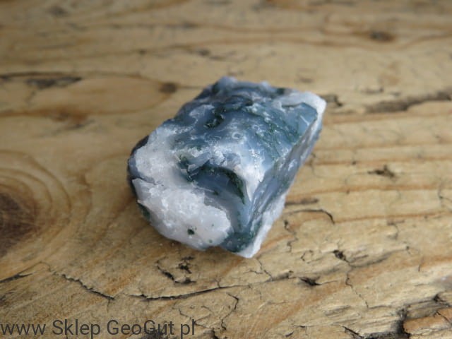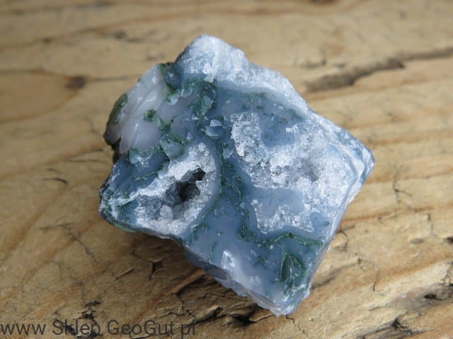 Agat mszysty to wyjątkowy kamień naturalny pochodzący z Indii, ceniony za swoje charakterystyczne, zielone inkluzje przypominające mech lub leśne krajobrazy. Prezentowany okaz występuje w formie surowej bryłki z kwarcem i naturalnymi geodami, co podkreśla jego autentyczność oraz unikatowy charakter.