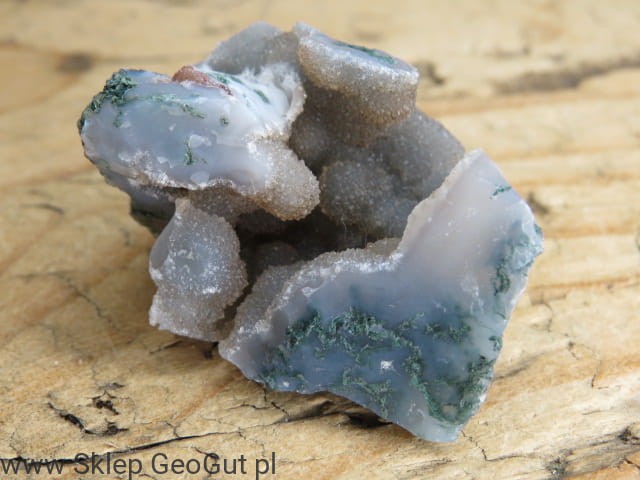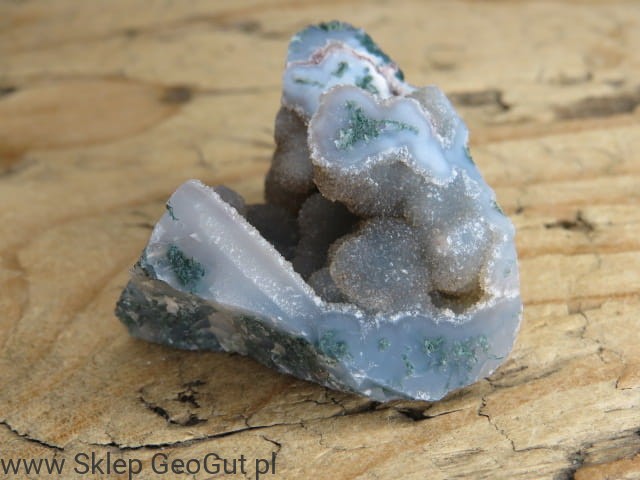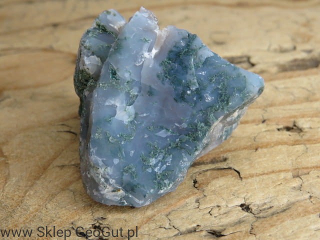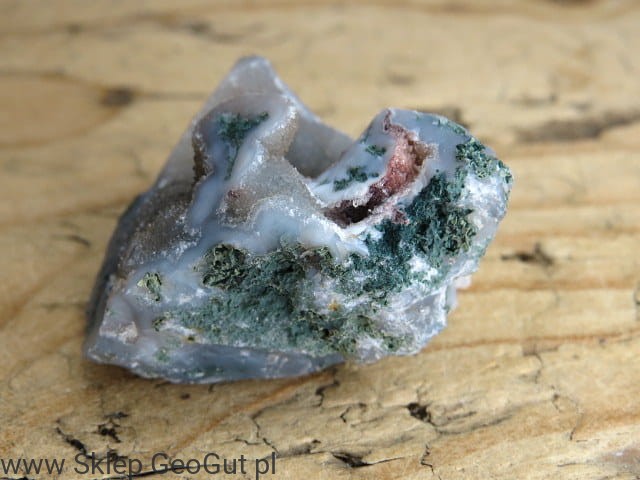 Agat mszysty to wyjątkowy kamień naturalny pochodzący z Indii, ceniony za swoje charakterystyczne, zielone inkluzje przypominające mech lub leśne krajobrazy. Prezentowany okaz występuje w formie surowej bryłki z kwarcem i naturalnymi geodami, co podkreśla jego autentyczność oraz unikatowy charakter.