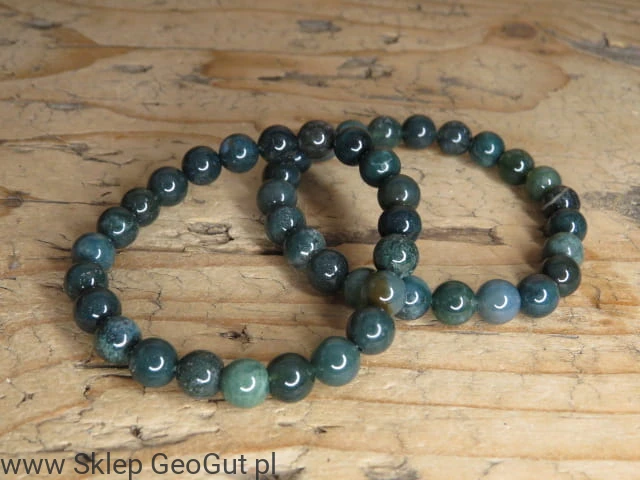 Bransoletka z agatu mszystego to naturalna biżuteria, która pięknie prezentuje się na nadgarstku. Została wykonana z wypolerowanych kamieni o wielkości około 8 mm, nawleczonych na elastyczną gumkę, dzięki czemu wygodnie dopasowuje się do nadgarstka o obwodzie około 16 cm.