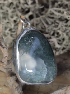 Wisior z agatu mszystego oprawionego w miedź i cynę.