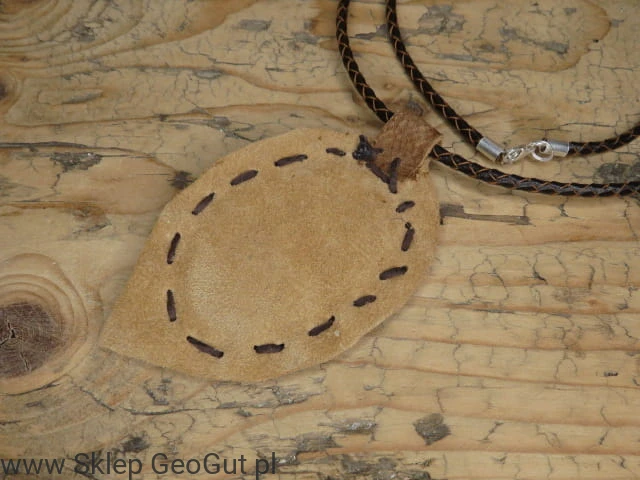 Kamień wypolerowany oprawiony w skórę. Ręcznie wykonany amulet wspierający spokój ogniska domowego.