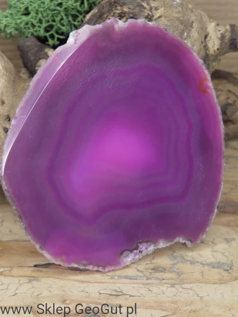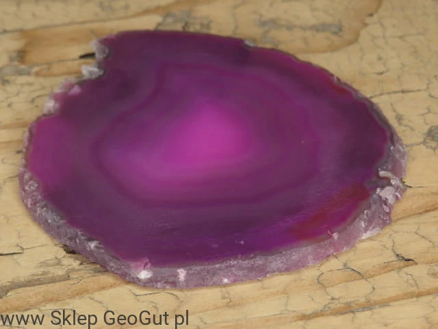 Dwustronnie polerowany plaster agatu. Kamień barwiony na kolor różowy.