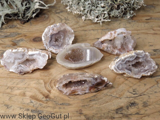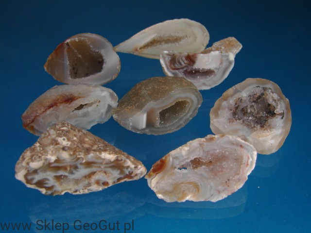 Okazy agatów z geodkami. Okazy posiadają poler na płaszczyźnie cięcia. Kolor - kremowy lub beżowy przechodzący w biały.