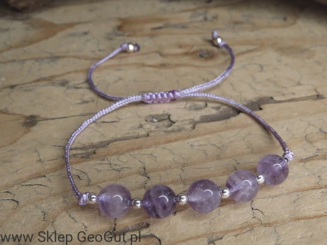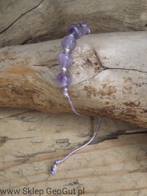 Minimalistyczna bransoletka z fasetowanych i gładkich ametystów, oraz kuleczek ze srebra Ag pr. 925 na fioletowym sznureczku. Zapięcie makramowe - regulowane, przesuwane.