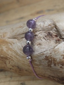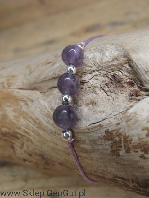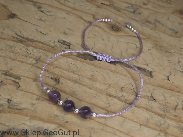 Minimalistyczna bransoletka z ametystów i kuleczek ze srebra Ag pr. 925 na fioletowym sznureczku. Zapięcie makramowe - regulowane, przesuwane.
